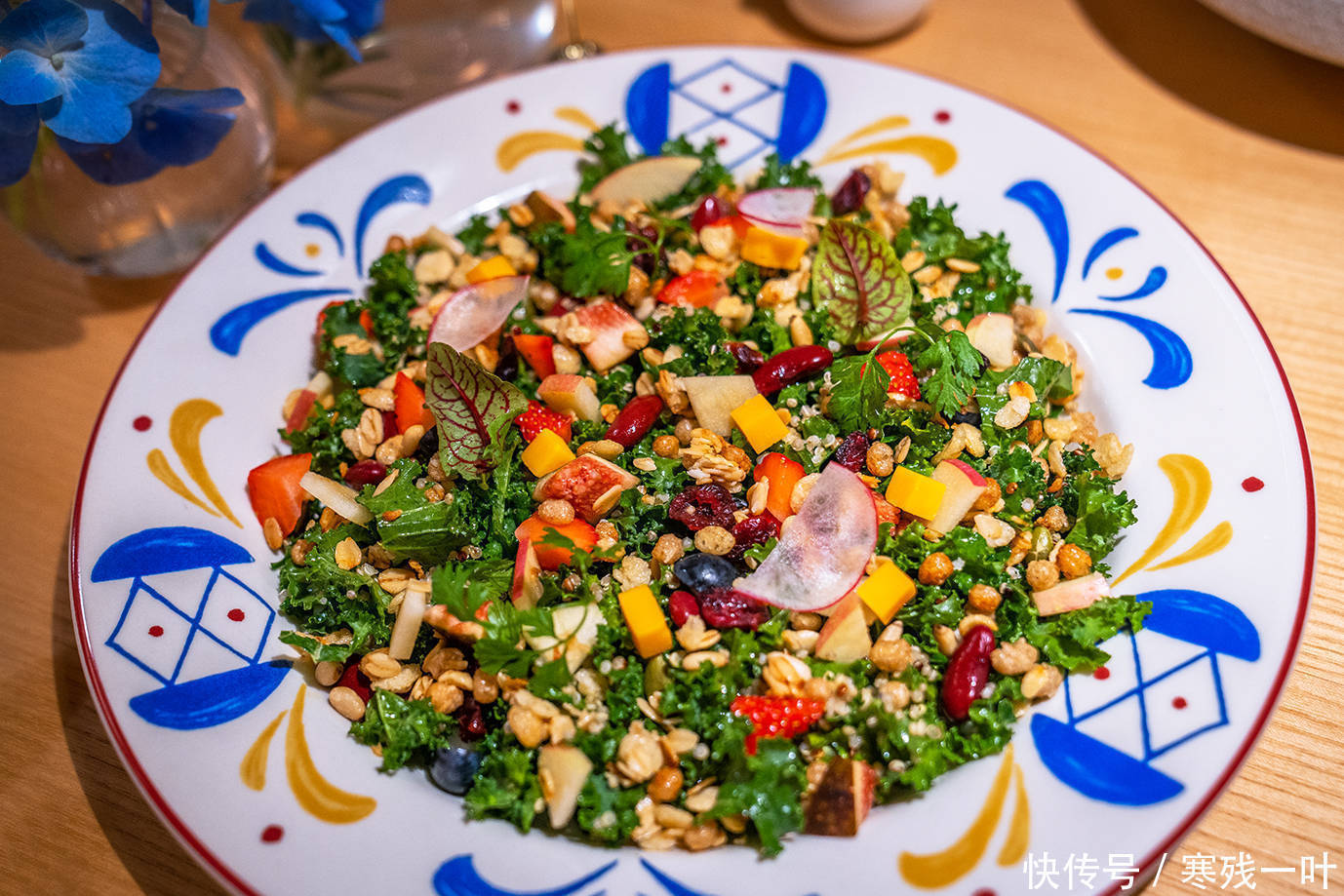 莓果藜麦羽衣甘蓝沙拉。看得出这是一个很有好意思感厨师作念的,各式食材搭配出一派如艺术品般的好意思食,让东说念主齐不忍心下筷,却又吸引着门客的味蕾。个东说念主很心爱这一说念,面子好意思味,养分健康。