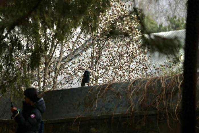 记者在现场看到,这棵玉兰树的花枝在灰瓦与松柏的掩映下异常细心。