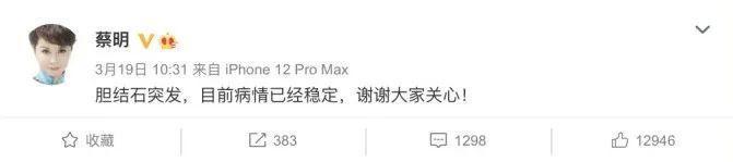 2021年3月,蔡明被曝出有胆结石,网上一组像片表示,蔡明在录制节目时突发不适,被送往病院。过后蔡明发微博回复我方“被要害送医”:胆结石突发,当今病情一经踏实。