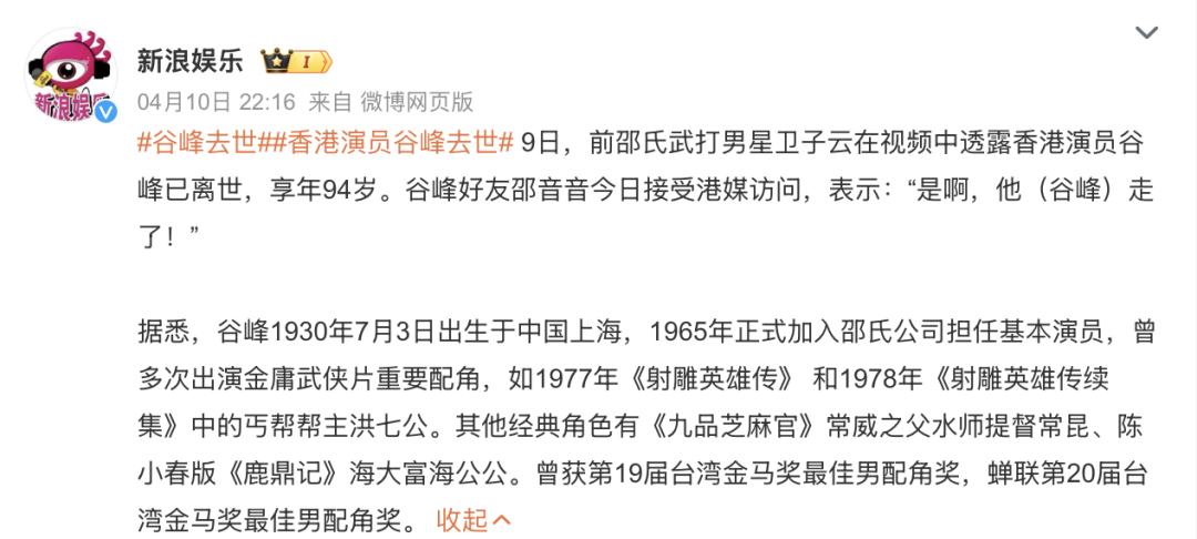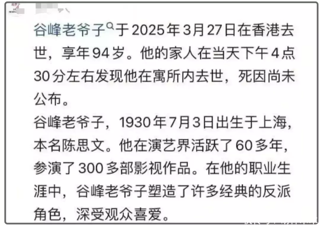据知情东谈主爆料,其实谷峰老爷子死字还是有一段日子了,他的家东谈主在3月27日下昼去他的住所时才发现老爷子还是在屋内驾鹤西去,但具体死因并未公布,手脚邵氏的老牌艺东谈主,谷峰老爷子在1965年就加入邵氏了,在演艺界活跃了60多年,一世共参演300多部影视作品。