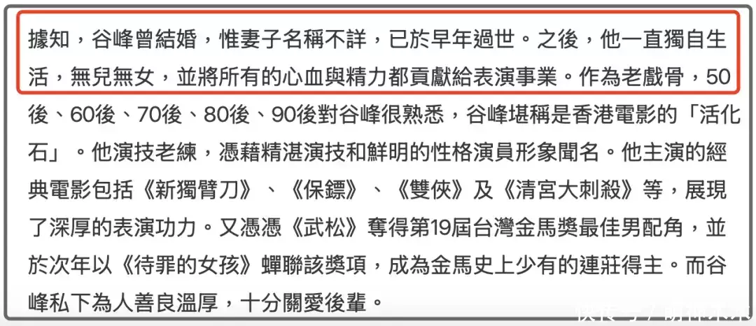 据悉,谷峰一世有过一次婚配,但太太的具体身份却从来莫得过报谈,只知谈谷峰的太太已于早年过世,二东谈主成亲本领并莫得要孩子,太太离世后谷峰莫得再婚,膝下无儿无女,是以这也能讲授谷峰死在家中后并莫得第一时间被发现,而是亲戚上门之后才发现的。