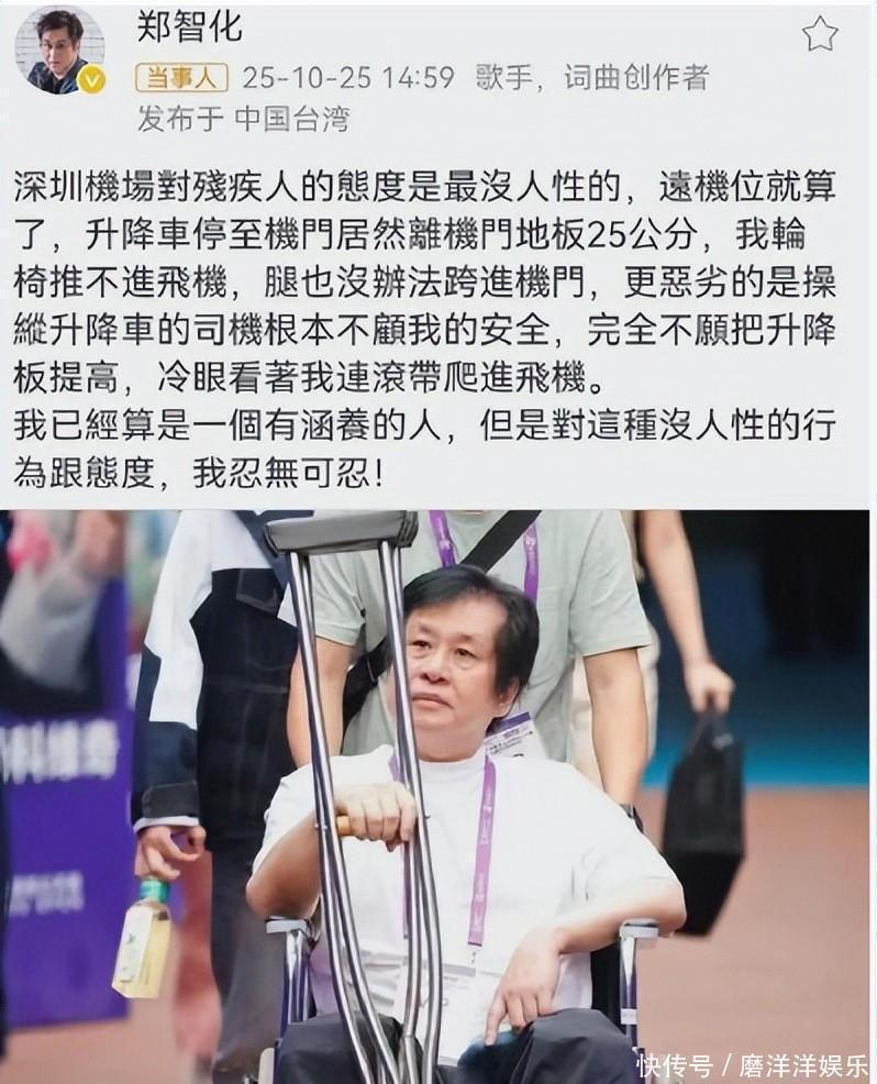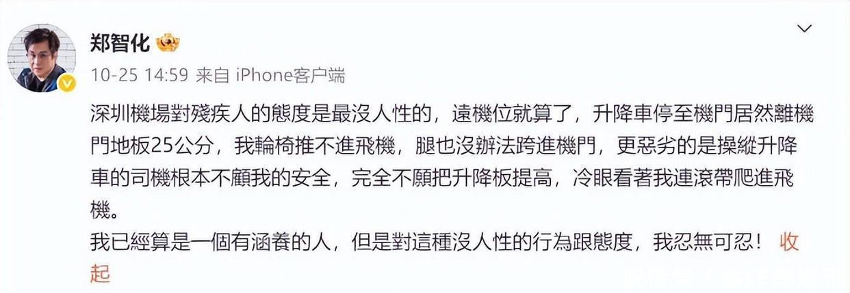 10月25日,歌手郑智化在微博上发声,月旦深圳机场“没情面味”,说因为升降车跟机舱门高差有25公分,他不得不“拚命滚爬”进去。这种画面感悉数的描写一下子激励了公众的大怒热议。