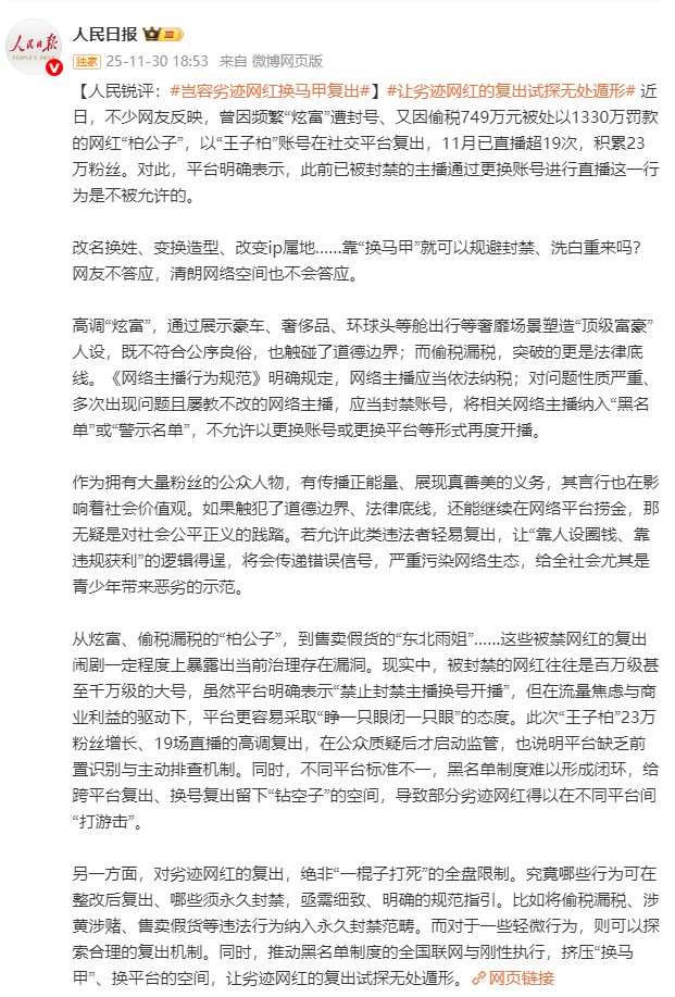 从炫富、偷税漏税的“柏令郎”,到售卖赝品的“东北雨姐”……这些被禁网红的复出闹剧一定进度上暴清晰现时科罚存在症结。试验中,被封禁的网红时常是百万级以至千万级的大号,诚然平台明确暗示“辞谢封禁主播换号开播”,但在流量急躁与生意利益的驱动下,平台更容易吸收“睁一只眼闭一只眼”的气派。这次“王子柏”23万粉丝增长、19场直播的高调复出,在公众质疑后才泉源监管,也证实平台缺少前置识别与主动排查机制。同期,不同平台尺度不一,黑名单轨制难以变成闭环,给跨平台复出、换号复出留住“钻空子”的空间,导致部分劣迹网红得以在不同平台间“打游击”。