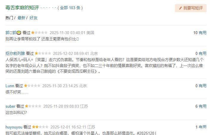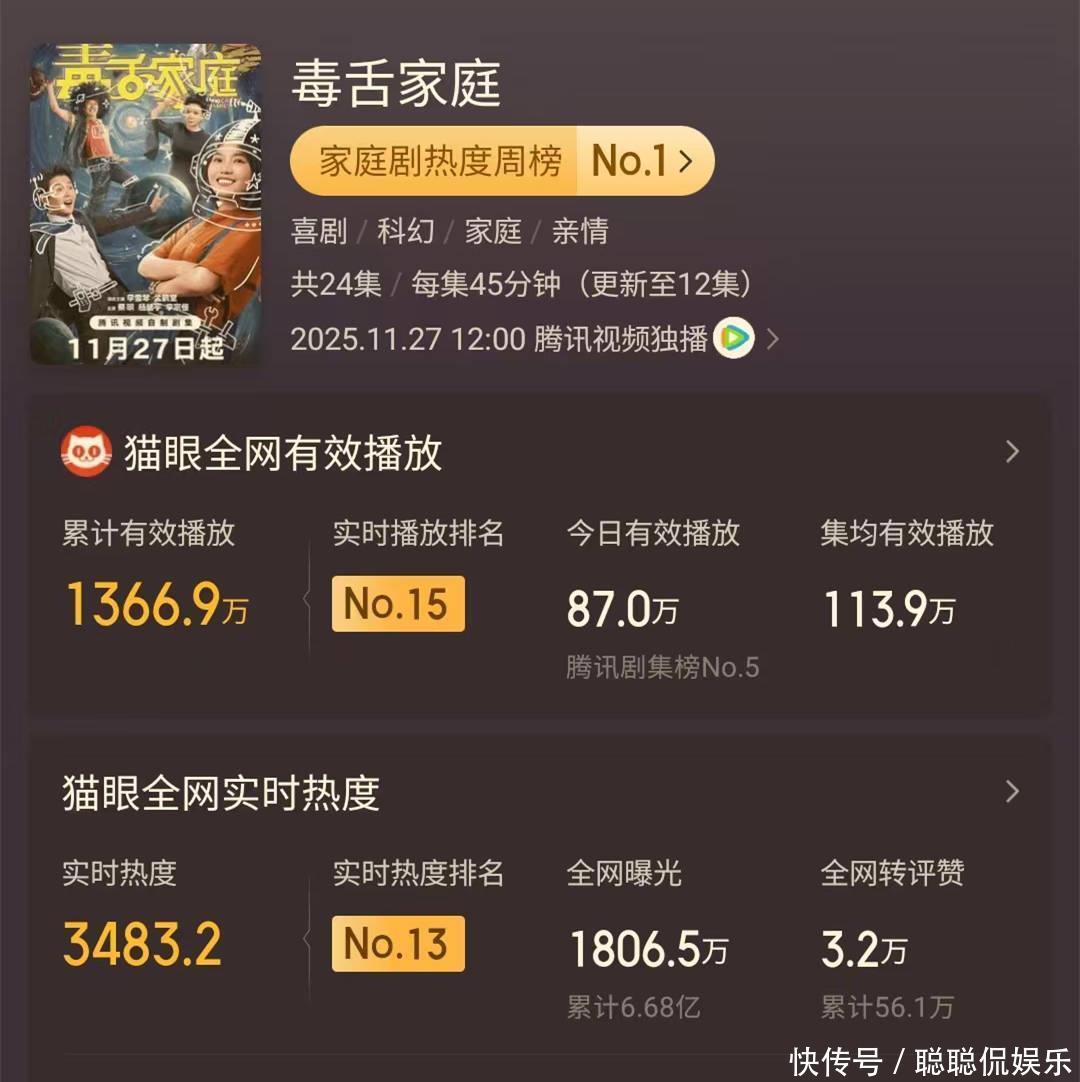 12月2日,电视剧《毒舌家庭》在腾讯视频也曾更新至第12集。该剧在贵寓平台上的音问表示,唯一24集的剧情。这意味着,这部由孟鹤堂、李雪琴等演员主演的电视剧,也曾播出过半。关联词,该剧的口碑可谓是一塌朦拢,灵验播放数字,也寒酸高出。豆瓣上,该剧近乎清一色的差评。灵验播放数字方面,该剧为止当今,只获取了1366.9万。