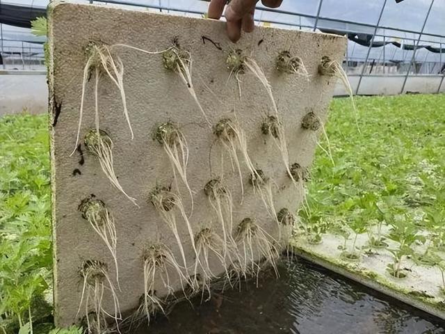 周志的大棚内一字排开分散着十几个池塘,池塘里悠扬着整王人的白色泡沫汲引面板,泡沫板上均匀分散着25个乒乓球大小的圆孔,水灵的白芹从圆孔中抽出绿叶。芹菜水培营养液并不复杂,周志说经管好大棚温湿度、光照就能高产。